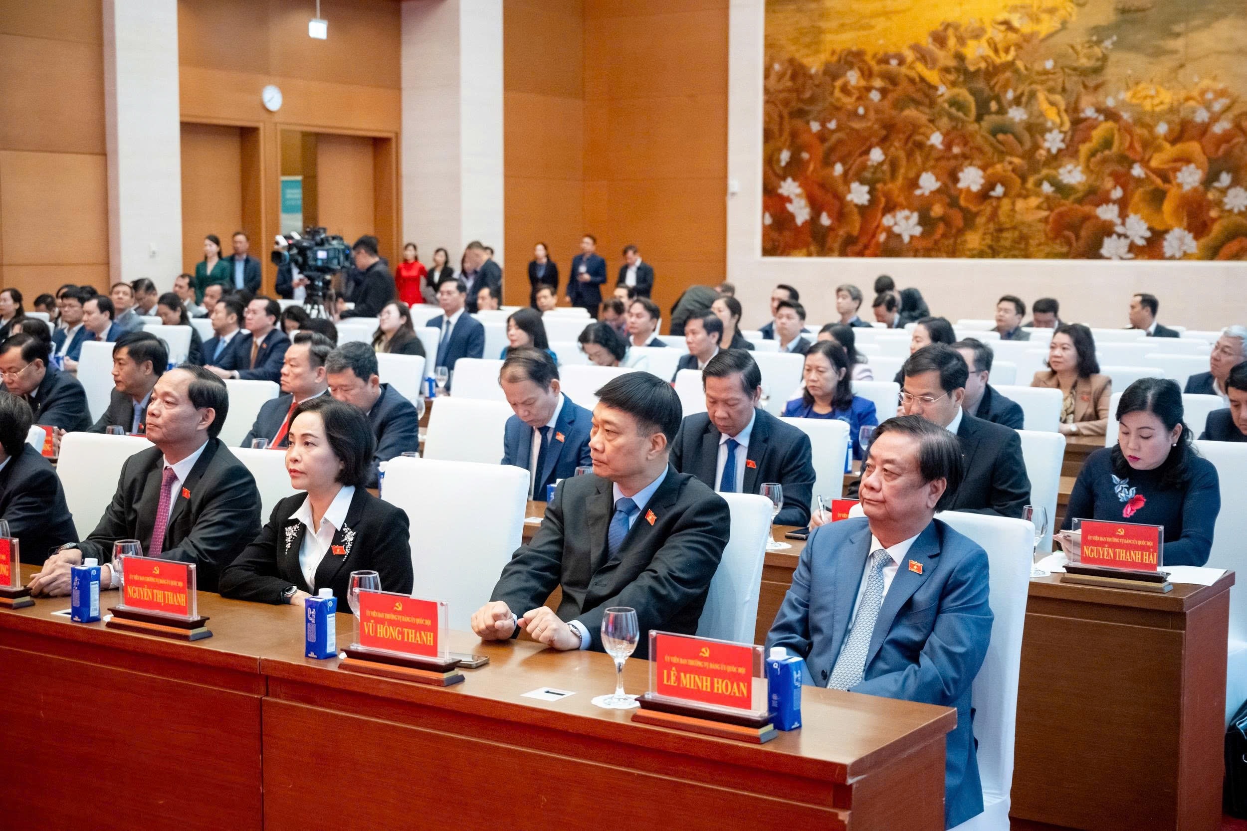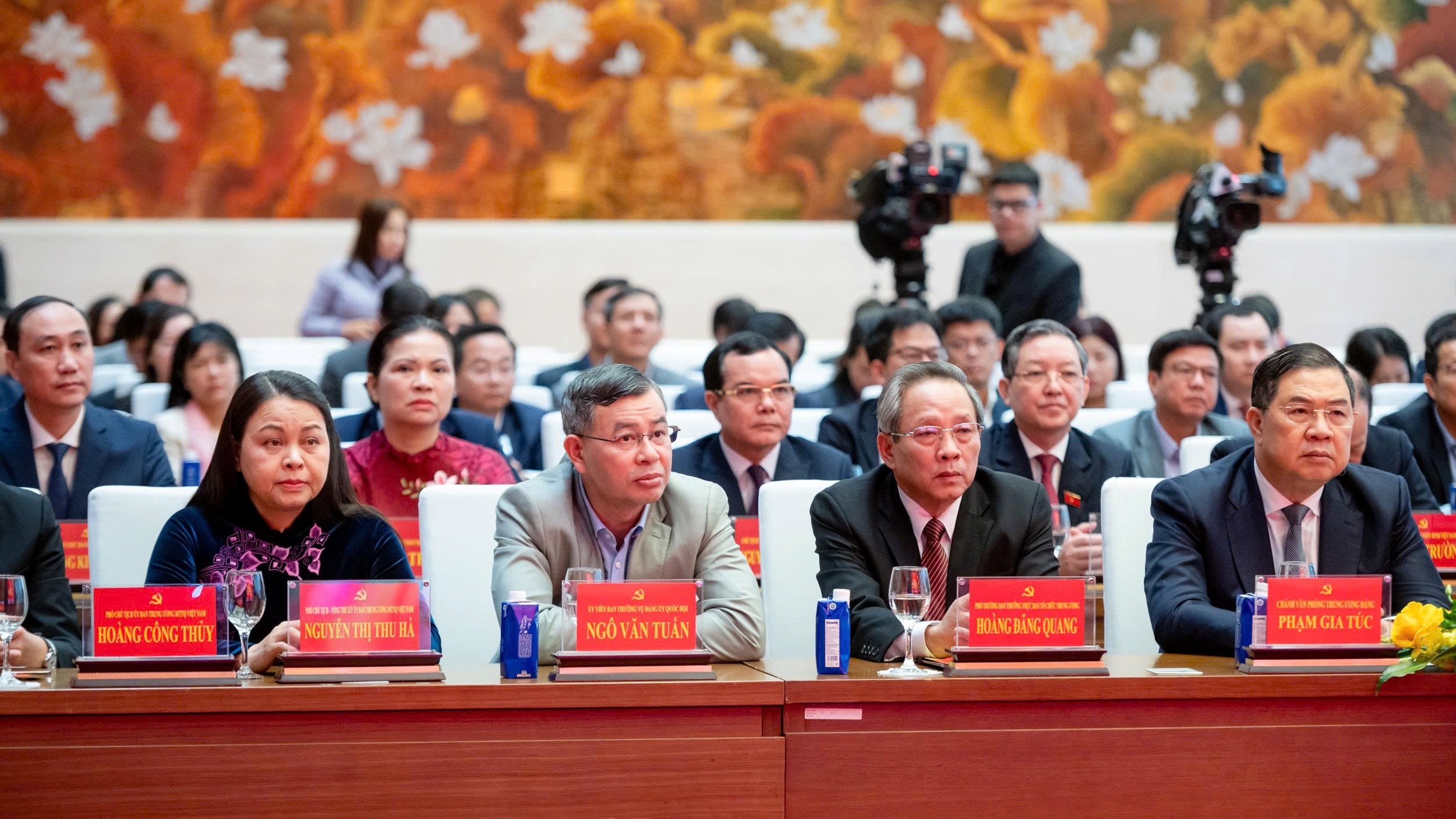 Tổng Bí thư Tô Lâm; Chủ tịch Quốc hội Trần Thanh Mẫn; Thường trực Ban Bí thư Trần Cẩm Tú; Trưởng Ban Tổ chức Trung ương Lê Minh Hưng; Chủ nhiệm Uỷ ban Kiểm tra Trung ương Nguyễn Duy Ngọc; các Phó Chủ tịch Quốc hội: Nguyễn Khắc Định, Nguyễn Đức Hải, Trần Quang Phương, Nguyễn Thị Thanh, Vũ Hồng Thanh, Lê Minh Hoan và các đại biểu dự buổi lễ. Ảnh: Phạm Thắng