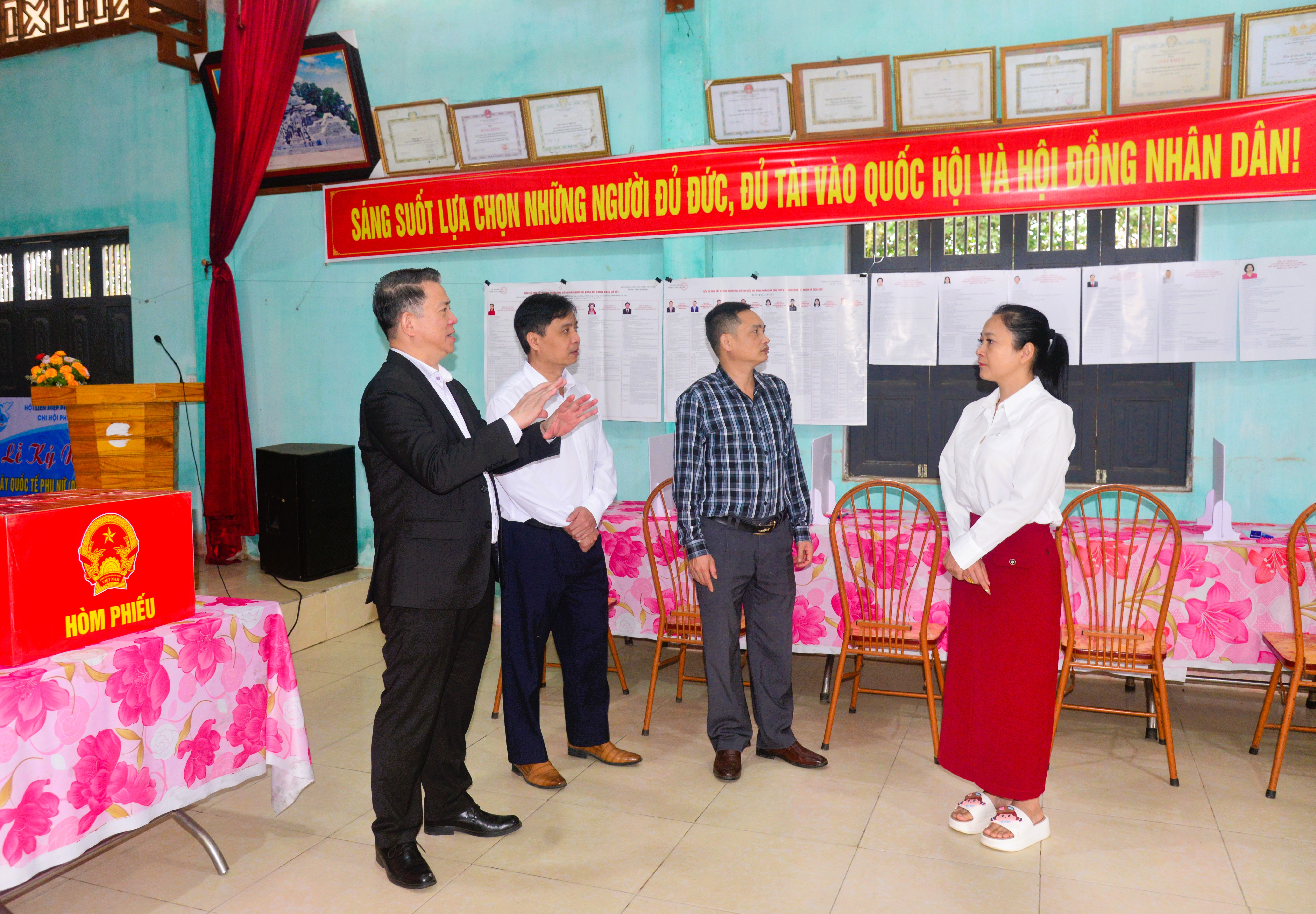 Trưởng ban Tuyên giáo và Dân vận Tỉnh ủy Trần Mạnh Lợi kiểm tra công tác bầu cử tại điểm bầu cử thôn Minh Phong, xã Yên Sơn.