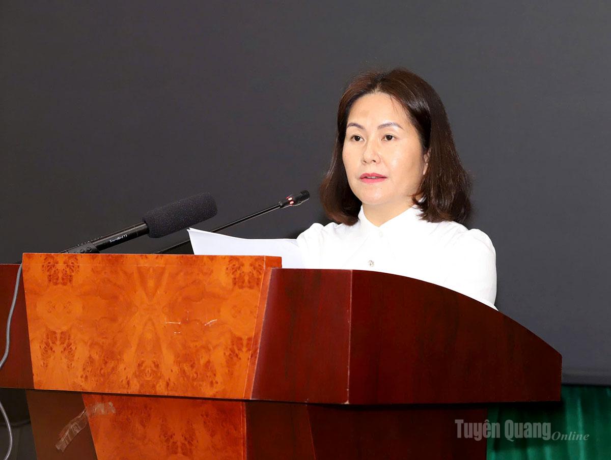 Bà Lý Thị Út, Trưởng phòng Giáo dục nghề nghiệp - Giáo dục thường xuyên, Sở Giáo dục và Đào tạo trình bày chương trình hành động.