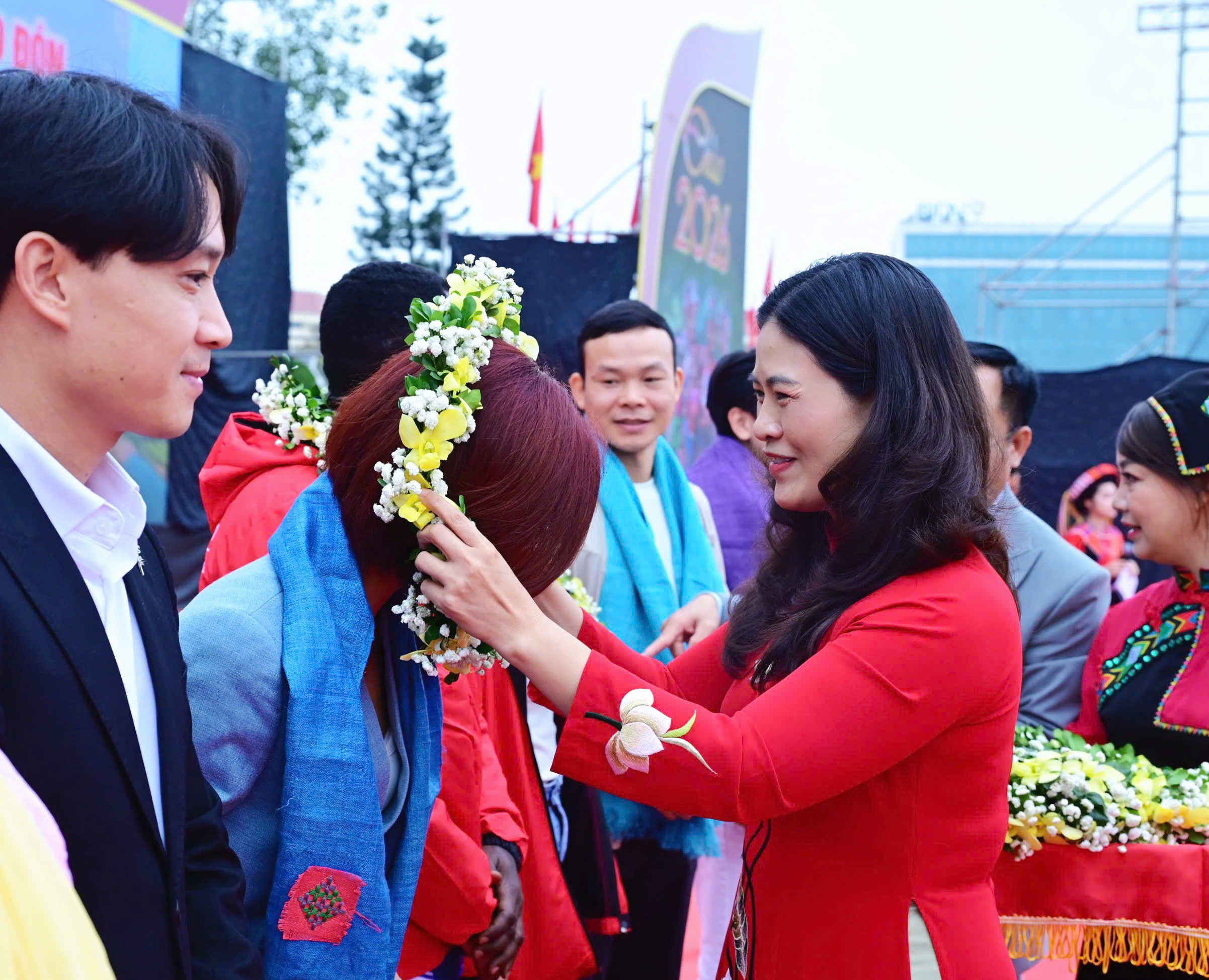 Phó Chủ tịch UBND tỉnh Vương Ngọc Hà tặng hoa cho những vị khách đầu tiên đến Tuyên Quang.