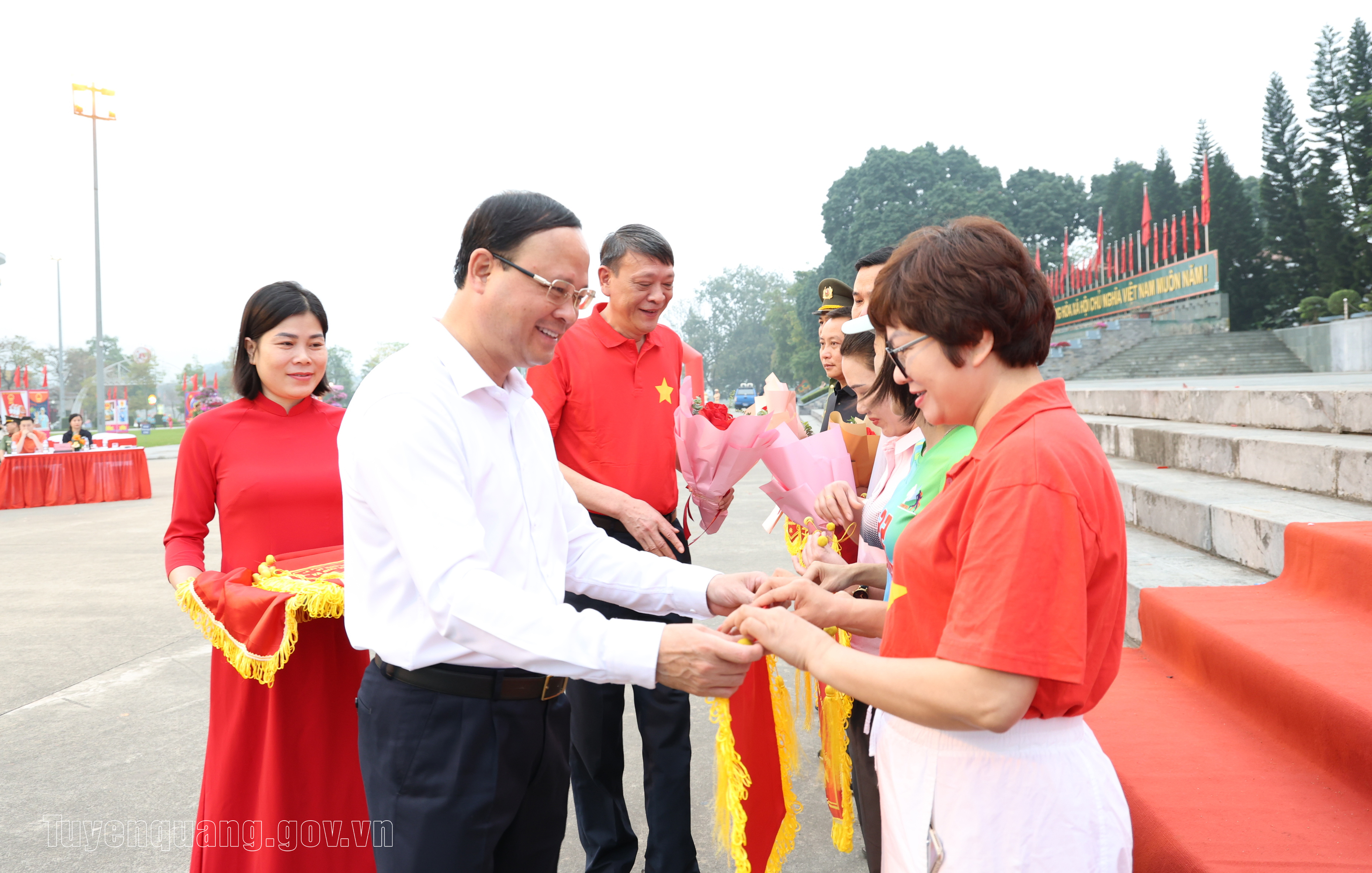 Các đồng chí lãnh đạo tỉnh trao cờ lưu niệm và tặng hoa cho các đoàn tham gia.