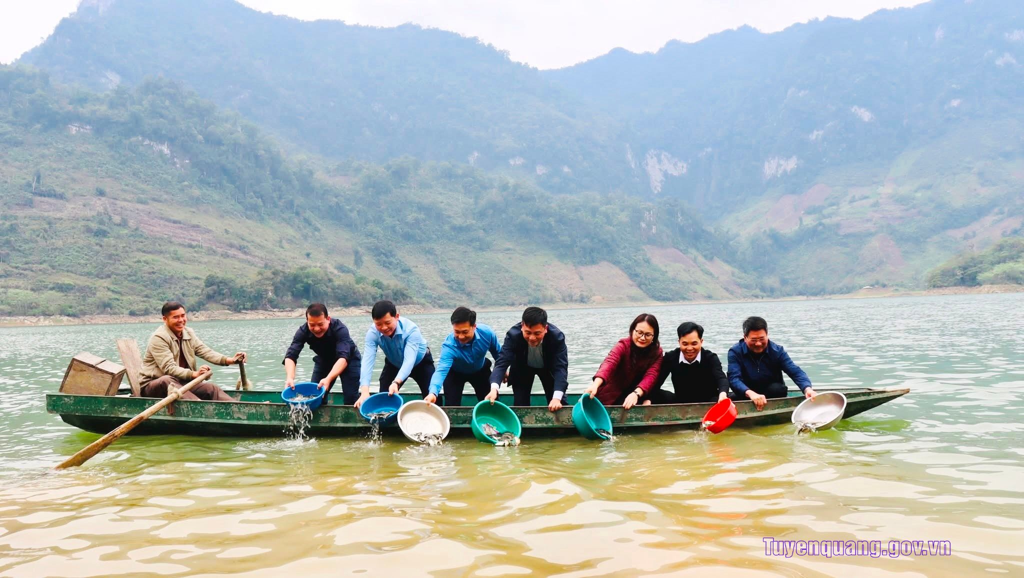 Lãnh đạo các xã Bắc Mê, Đường Hồng, Yên Cường, Minh Ngọc tỉnh Tuyên Quang tổ chức thả cá giống tái tạo nguồn lợi, phục hồi sinh cảnh thủy sinh trên sông Gâm.