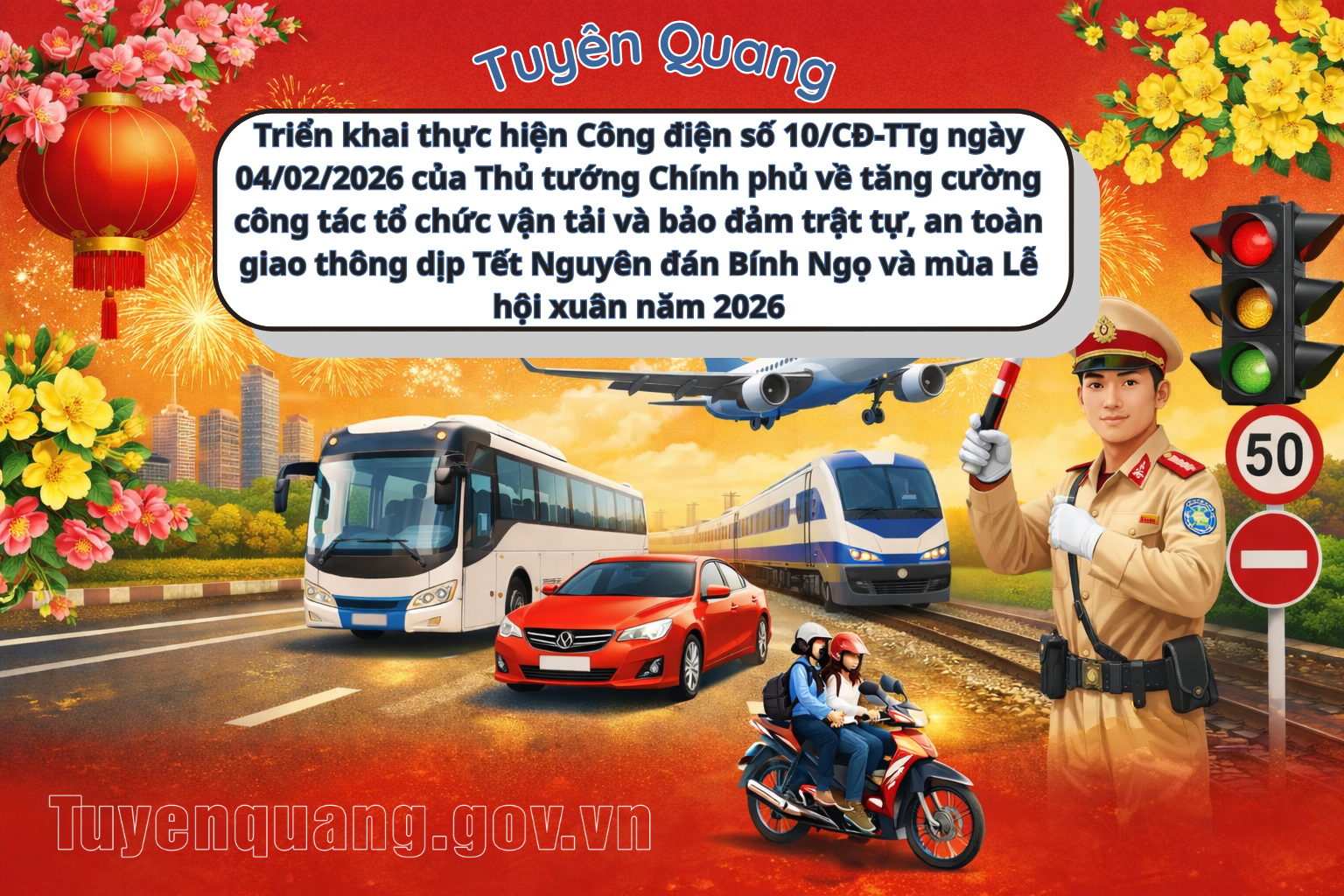 Công an tỉnh tăng cường lực lượng, phương tiện tuần tra, kiểm soát trên các tuyến giao thông trọng điểm, khu vực bến xe, cảng, bến thủy nội địa, bến đò ngang và địa điểm tổ chức lễ hội; xử lý nghiêm các hành vi vi phạm là nguyên nhân chủ yếu gây tai nạn giao thông; chủ động phân luồng, điều tiết giao thông, kịp thời xử lý ùn tắc, không để xảy ra ùn tắc kéo dài; phối hợp kiểm tra, giám sát hoạt động vận tải trong dịp Tết và Lễ hội xuân.