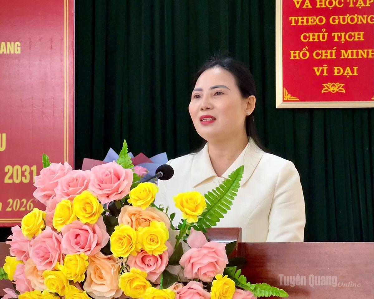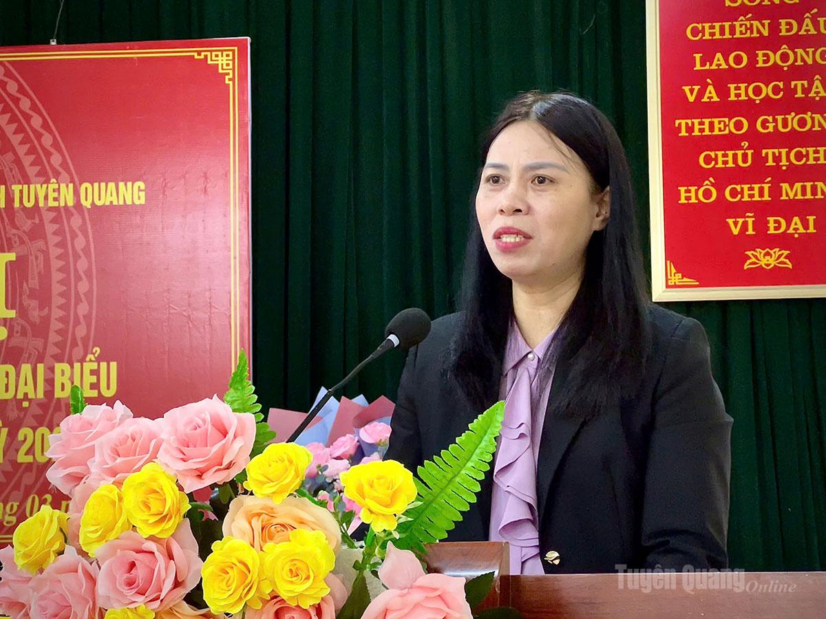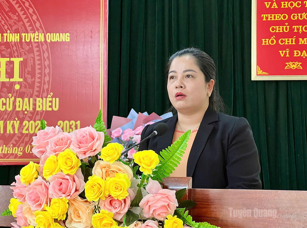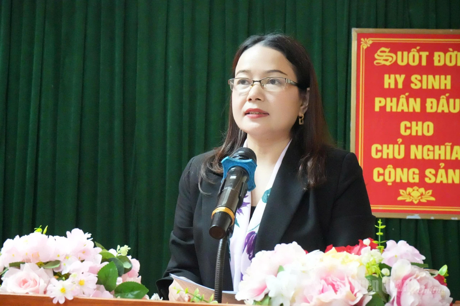 Đồng chí Lý Thị Lan, Ủy viên BTV Tỉnh ủy, Trưởng Đoàn ĐBQH hoạt động chuyên trách khoá XV tỉnh Tuyên Quang phát biểu tại hội nghị tiếp xúc cử tri xã Thắng Mố.