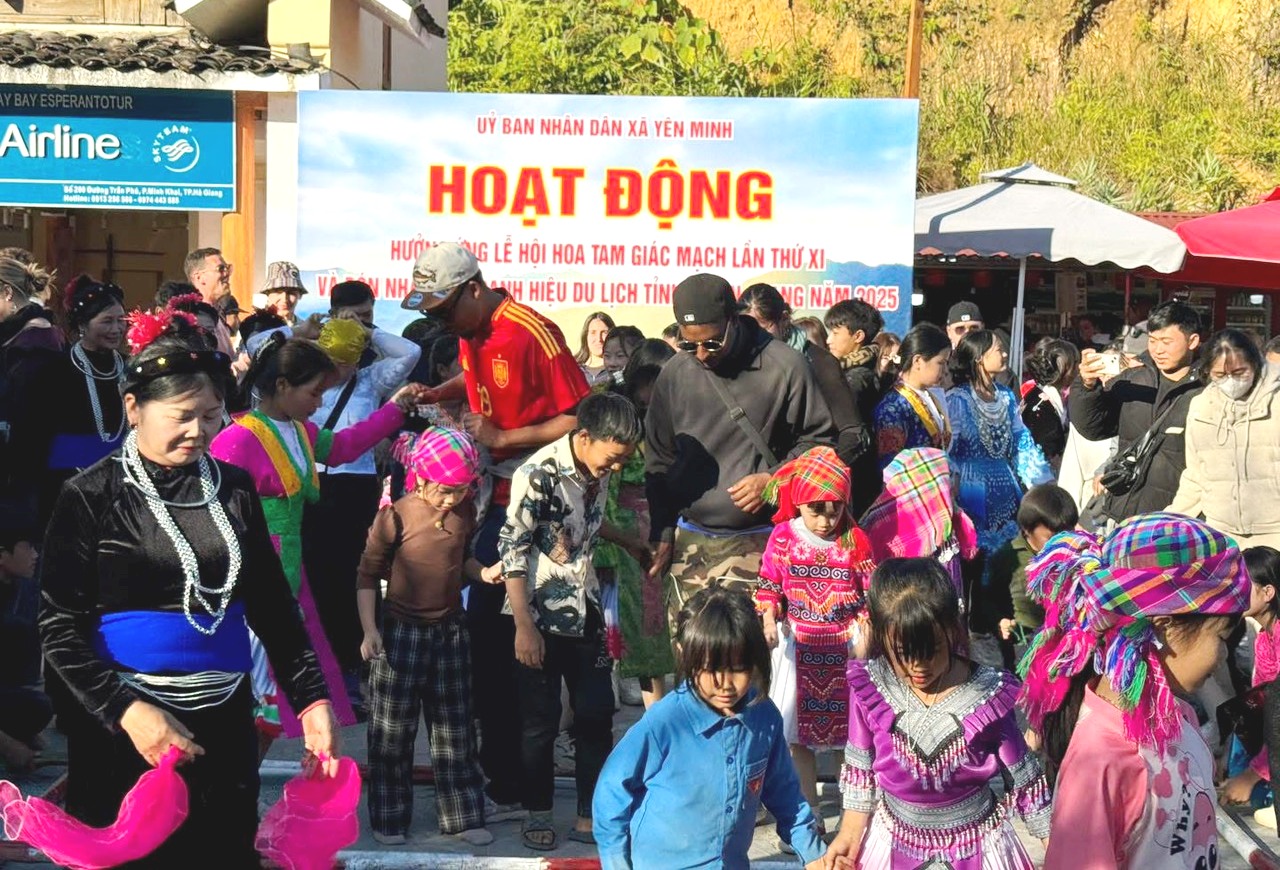 Khách du lịch tham gia nhảy sạp với người dân xã Yên Minh năm 2025.